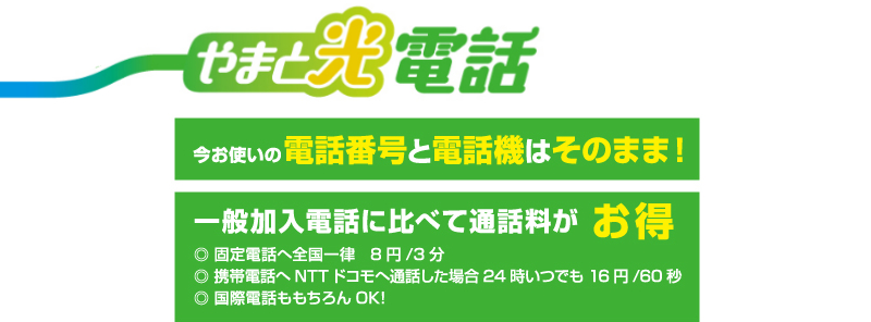 やまと光でご利用いただける、IP技術を使った安心・快適な固定電話サービス、それが「やまと光電話」です。「やまと光電話」は、今お使いの電話番号や電話機がそのまま使え※2※3、月額基本料や通話料がぐんとお安くなります。 緊急通報(110番・119番)へも発信できて安心です。※4 NTT西日本のフレッツ光回線を利用しますので、最大概ね1Gbpsの超高速通信でブロードバンドも快適に楽しみいただけます。